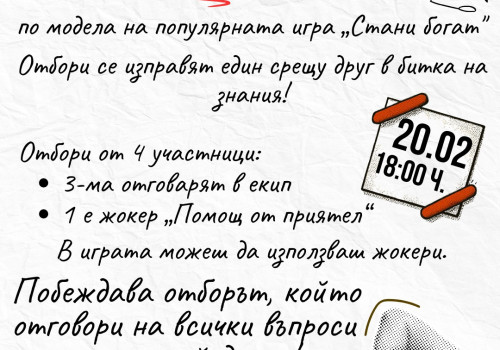 Викторина „Умни, здрави, със знания богати“ предизвиква знанията и отб... Форматът е вдъхновен от популярната игра „Стани богат“ и съчетава знание, бързина и екипна работа 20/02/2026