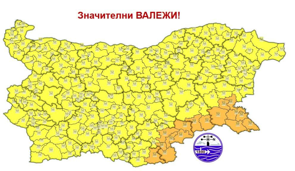 Оранжев и жълт код обявиха от Националния институт по метеорология и хидрология (НИМХ) за понеделник. Оранжев код е за областите Кърджали, Хасково, Ямбол и Бургас. В останалата част от страната е в сила жълт код.